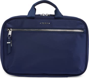 This travel-ready cosmetics bag has three transparent interior compartments and a removable pouch for optimal organization. You can lay it flat or hang it from a fixture when open.