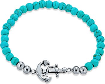 An anchor shines alongside turquoise ball beads on this stretchy statement bracelet that easily slips on and off.