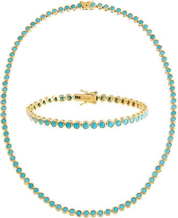 Dainty bezel-set turquoise bring a pop of color to this elegant tennis necklace and bracelet set finished in warm 14-karat gold.