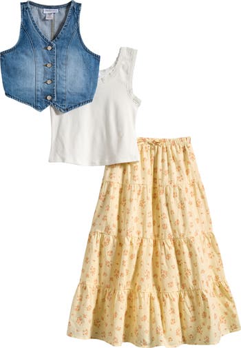 Refresh your kiddo's warm-weather wardrobe with this three-piece set featuring a faded denim vest, lace-trimmed tank and floral-tiered skirt.