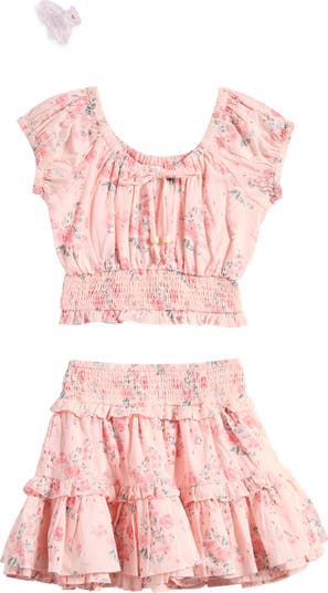 They’ll be ready for sunny days in this breathable eyelet top‑and‑tiered‑skirt set covered in flowers and complete with a butterfly‑shaped claw clip.