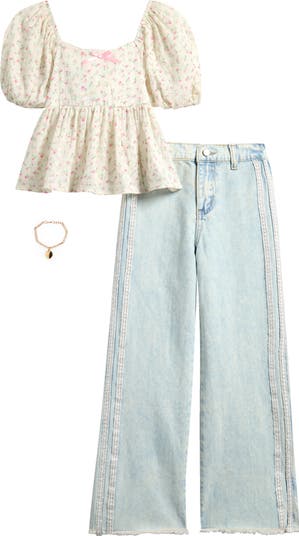 Give your kid sweet style that's right on trend with this three-piece set including a puff-sleeve crop top, lace-trimmed wide-leg jeans and a charm bracelet.