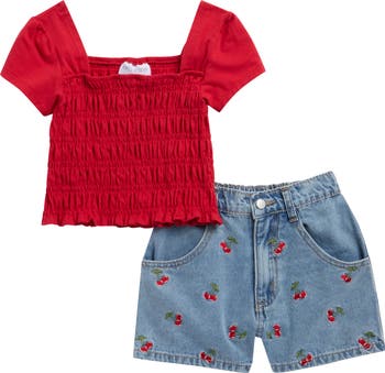 Your kiddo will be ready for warm-weather days in this smocked top paired with cherry-embroidered denim shorts.