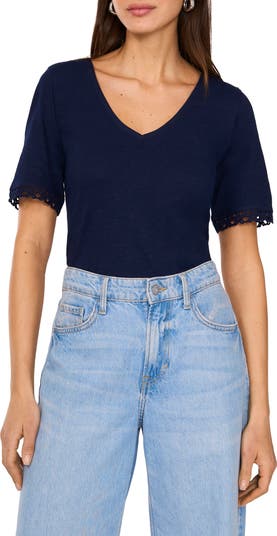 Lacy trim details the short sleeves of this soft all-cotton T-shirt cut in a slightly relaxed fit with a classic V-neckline.