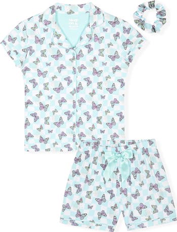 Your little dreamer will love cozying up in these two-piece short pajamas featuring a matching scrunchie for added fun.