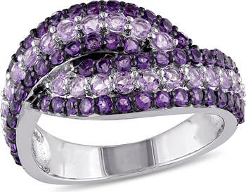 A crossover ring secured in a sterling silver setting is encrusted with two-tone amethysts for a pop of color.
