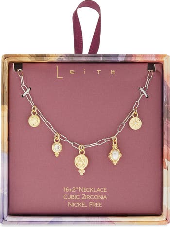 Perfect to layer or wear solo, this two-tone necklace is strung with mixed charms illuminated by sparkly cubic zirconia and a lustrous cultured pearl.
