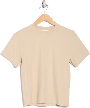 Achieve a borrowed-from-the-boys look in this basic crewneck T-shirt made with a boxy fit and abbreviated length for casual appeal.