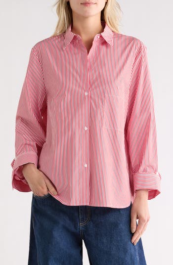 Fine stripes neatly pattern this button-up shirt made from breathable cotton with a roomy fit designed to keep you relaxed on sunny days.