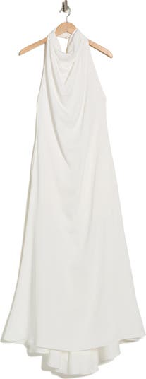 A drapey halter neck and alluring open back frame this flowy maxi dress cut in a graceful A-line silhouette.