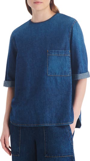Cuffed elbow-length sleeves frame a roomy denim shirt touched up with contrast top-stitching and a commodious patch pocket.