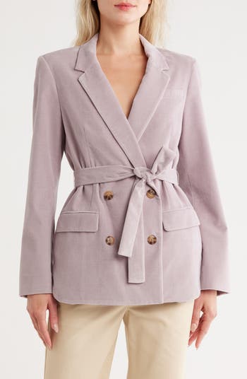 Peak lapels elegantly frame this menswear-inspired jacket designed in a double-breasted silhouette from a rich corduroy fabric.