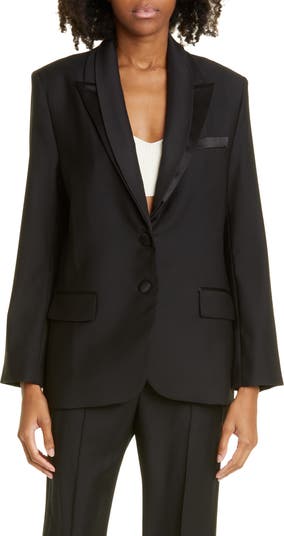Made of breathable wool, this classic tuxedo jacket features satin details and a layered lapel.