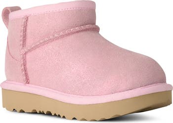 Kids can enjoy the cozy softness of this abbreviated version of a classic UGG boot boasting an ultrashort shaft and sparkling finish. The style delivers extra comfort with a lining crafted from UGGplush, a moisture-wicking textile made from a wool-rich blend but crafted to feel and wear like genuine shearling.