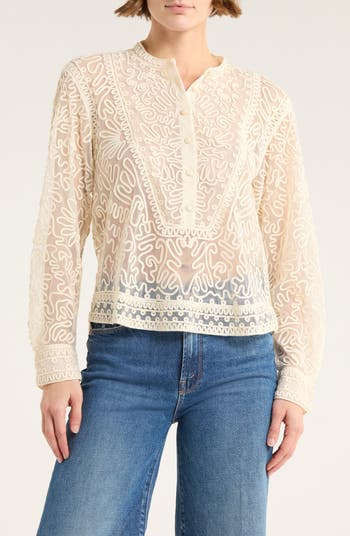 An intricate corded pattern done in a tonal color lends depth and dimension to this long-sleeve top cut from a semiopaque organza.