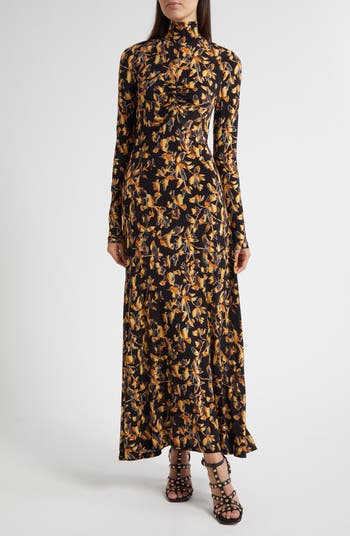 Front ruching completes the curve-skimming silhouette of this long-sleeve knit-jersey dress covered in a lively print.