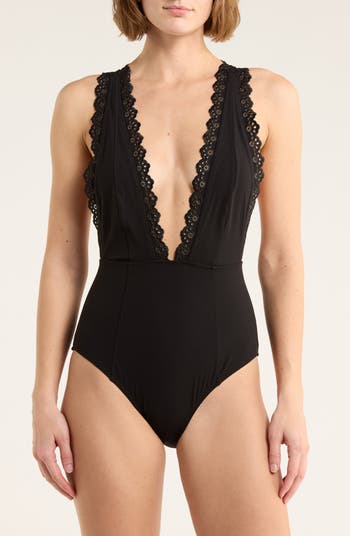 A strappy back and plunging neckline turn up the heat of a one-piece swimsuit elevated by scalloped, eyelet trim and expertly placed topstitching that mimics your favorite lingerie.