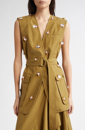 Fluttering floral appliqués bring enchantment to a structured longline vest designed with a tie belt that cinches its silhouette.