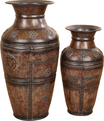A set of iron floor vases showcase sculptural silhouettes and intricate floral motifs bringing a warm, rustic charm to any space.