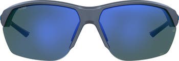 A half-rim design with smooth curves define these sporty sunglasses featuring brightly tinted lenses.