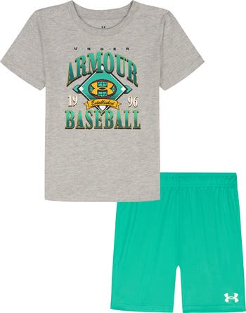 This comfortable, kid-approved set features a short-sleeve crewneck T-shirt and pull-on shorts, both featuring sporty logo graphics.