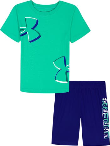 This comfortable, kid-approved set features a short-sleeve crewneck T-shirt and pull-on shorts, both featuring sporty logo graphics.