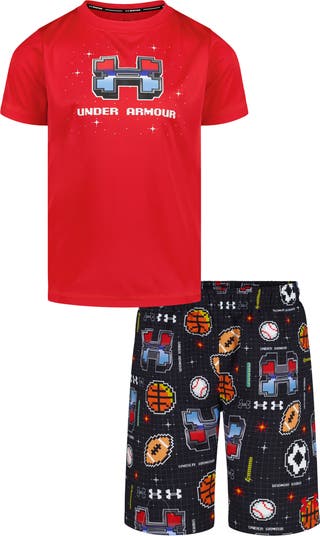 Your game-loving kiddo will be delighted by the graphics on the T-shirt and swim shorts of this summery set made with a water-resistant finish and built-in sun protection.