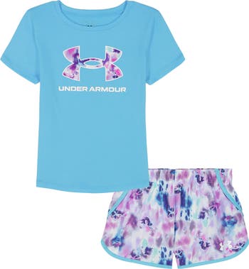 This comfortable, kid-approved set features a short-sleeve crewneck T-shirt and dolphin-hem shorts, both featuring sporty logo details.