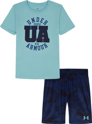 This comfortable, kid-approved set features a short-sleeve crewneck T-shirt and pull-on shorts, both featuring sporty logo graphics.