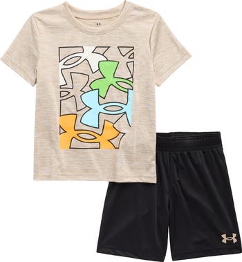 Keep your little athlete cool and comfortable in this long-sleeve T-shirt with a sporty graphic print and coordinating pull-on shorts.