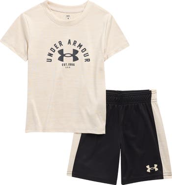 Keep your little athlete cool and comfortable in this long-sleeve T-shirt with a logo graphic print and coordinating pull-on shorts.
