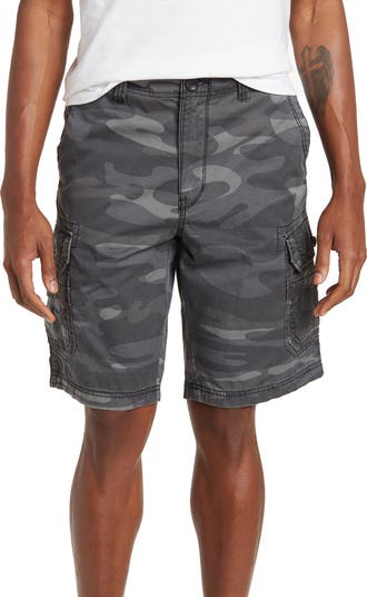 Camo printed cotton cargo shorts offer military-inspired style and functional utility.