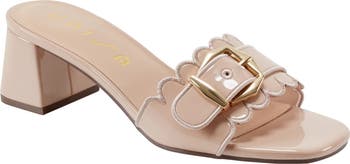 Stitched scalloped edges and an octagon-shaped buckle add contemporary intrigue to a slide sandal lifted by a sculptural block heel.