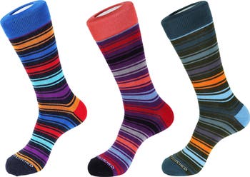 Vibrant hues update the look of this trio of crew socks that are rendered in stripes and knit from stretchy cotton-blend yarns.