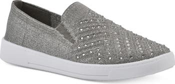 Tonal rhinestone studs adorn the stretch knit vamp of this slip-on lifted by a low wedge sole.