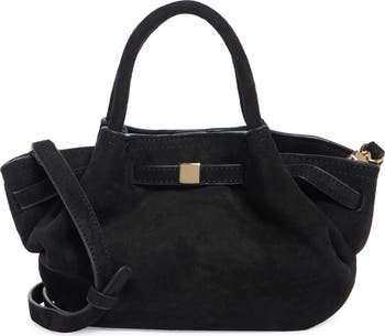 A sleek faux-suede crossbody bag accented with gleaming hardware and a removable crossbody strap is designed for effortless everyday style.