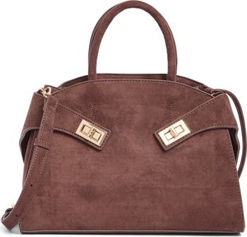 Twin turn-lock buckles define the gusseted silhouette of a polished faux-suede shoulder bag that's outfitted with an optional crossbody strap, perfect for everyday use.