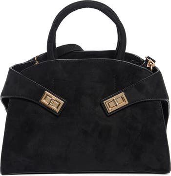 Twin turn-lock buckles define the gusseted silhouette of a polished faux-suede shoulder bag that's outfitted with an optional crossbody strap, perfect for everyday use.