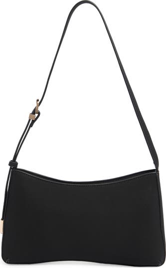 Slight curvature lends modern detail to the structural profile of a shoulder bag crafted from smooth faux suede.