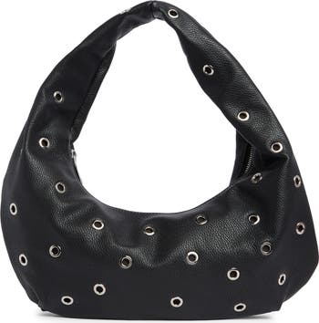 Polished grommet accents bring industrial-inspired styling to this spacious hobo bag constructed from supple faux leather.