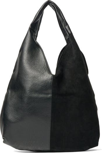 Carry your essentials in this roomy tote bag constructed from soft faux suede and faux leather in a slouchy silhouette.