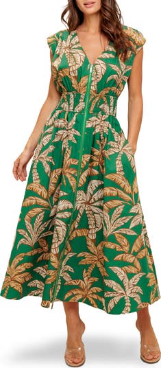 Cap sleeves and front zipper bring a laid-back finish to this tropical print midi dress.