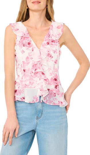 Ruffled edges and charming blooms add romantic appeal to a lightweight woven top that's a chic choice for date nights.