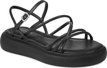 A pillowy platform and padded footbed serve cushioned comfort in this strappy sandal with an inky monochrome design.