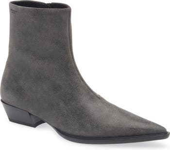 A pointy toe elongates the silhouette of an ankle-grazing bootie lofted by a wrapped setback heel for easy strides.