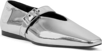 A slender square toe and metallic upper add contemporary elements to a luxe patent leather flat fashioned with an adjustable mary jane strap for a secure fit.
