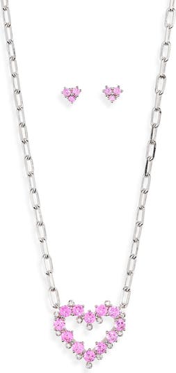 Sweeten your accessory collection with this set of heart-shaped stud earrings complete with a matching pendant necklace shimmering with cubic zirconia.