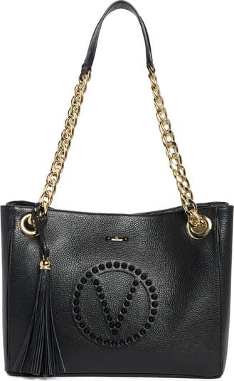 Brand-signature rock studs outline the logo of an elegant Italian-crafted leather tote bag topped with a set of chain trimmed top handles.