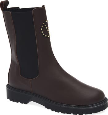 Studded VLOGO hardware gleams at the topline of this pull-on Chelsea-inspired boot grounded by a toothy lugged sole.