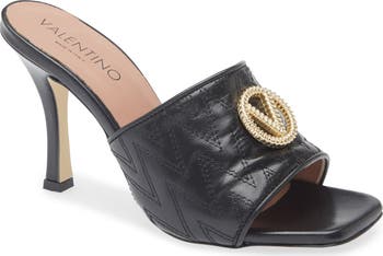 Chevron quilting details a leather sandal that is emblazoned with a gkeaming gold-tone logo medallion.
